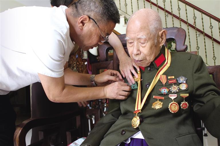 8月22日,99歲的我省抗戰(zhàn)老戰(zhàn)士劉炳榮佩戴國家頒發(fā)的“中國人民抗日戰(zhàn)爭勝利80周年”紀念章。 本報通訊員 吳寬宏攝