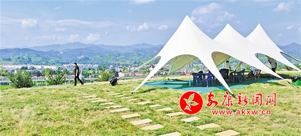 當我賞罷一馬平川的恒口貢米基地,邁步田園后面的緩坡,走過以“稻夢時光”統一冠名的彩虹路、孝義文化長廊、研學基地、民宿群落,來到土坡頂臺上的這塊綠地,目……